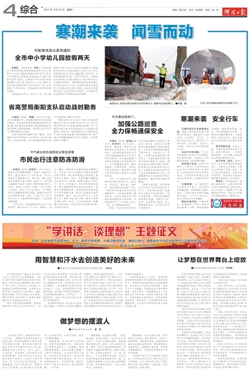 本报讯 (记者 周围) 12月25日起,为应对寒潮天气,省高警局衡阳支队启动战时勤务,在易结冰的桥梁路段提前放置安全锥、警示牌、融雪剂等物资,通过密集巡逻、压缩车道等交通管制措施,增设警示标志等方式,确保道路安全畅通。