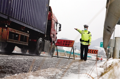 道路结冰,高速交警在融雪车未到的情况下,提醒司机减速慢行。■周围 摄