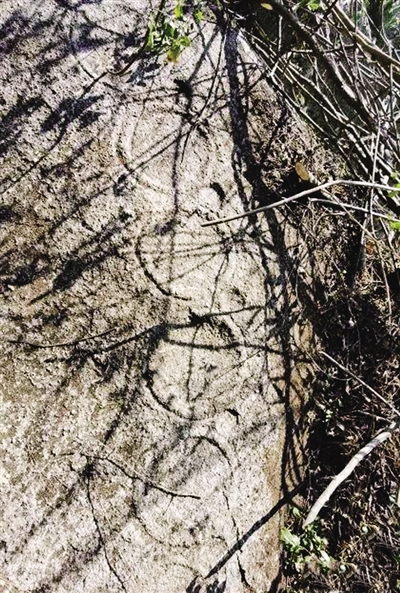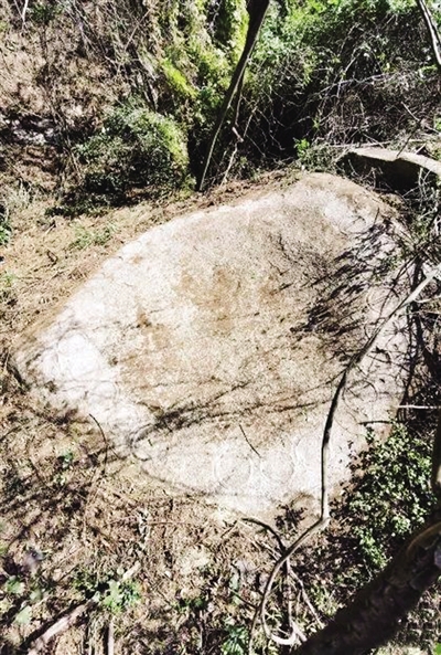 这里巉(chán)崖如削,怪石嵯峨,古藤绕树,巨木撑天。在石木头的东面山坡上,依岩就势,略事整理,打造成一个浅锅底状的圆盘。石盘直径3.66米,边缘有29个阳刻的圆圈,圈子直径30厘米。这些圈子分为两组,一组12个,另一组17个。两组相接处,各空一个圆圈的位置。圈与圈之间的外沿,有阴刻小圈,直径8厘米。石盘斜倾,朝向西北的祝融峰。