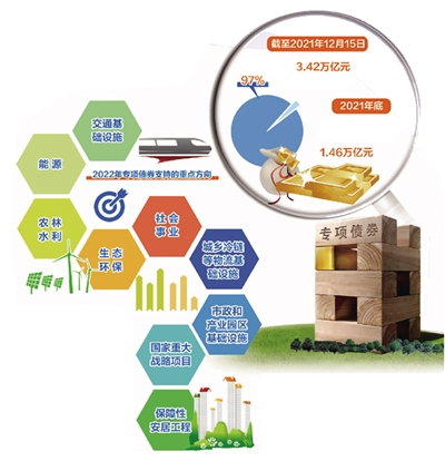 中央经济工作会议要求,“积极的财政政策要提升效能,更加注重精准、可持续。要保证财政支出强度,加快支出进度”。专家认为,2022年专项债券将保持一定力度,更好发挥拉动有效投资、稳定宏观经济大盘的重要作用。