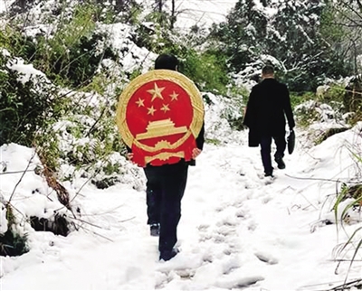 2月23日,衡阳县人民法院洪市法庭法官背着国徽,冒着严寒,踏雪赶至当事人所在的洪市镇清塘村组织庭审。
