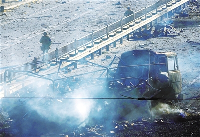2月26日,乌克兰基辅,乌克兰士兵经过被烧的车辆。■视觉中国供图