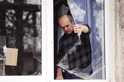 2月24日,顿涅茨克当地居民查看受损的房屋。 ■新华社发