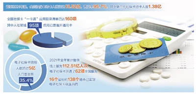 2018年4月22日,人社部在福州首届数字中国建设成果展览会上签发首张全国统一的电子社保卡。此后,社保卡不断实现线上线下全面打通,更多元的服务生态圈正逐渐形成。目前,电子社保卡领用人数超过5亿,人口普及率35.4%,可通过400多个App、小程序等渠道获取电子社保卡服务,2021年全年累计提供线上服务112.51亿人次。人社部信息中心副主任宋京燕介绍,电子社保卡与实体社保卡一一对应、状态相同、功能相通,是社保卡的两种形态,为持卡人带来线上线下自由选用的便利服务。