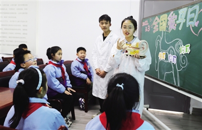 3月3日, 在雁峰区中南路小学,来自南华大学的青年志愿者在给小学生们讲解耳朵的结构和爱耳护耳知识。