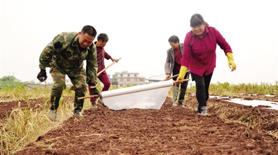 4月14日,在衡南县谭子山镇炮公村,村民正在覆盖地膜,准备种植香瓜、西瓜。去年,衡南县福祥农机农技种养专业合作社在当地开垦10余亩荒山,种植蔬菜瓜果,让昔日贫瘠荒山变为致富“金山”。