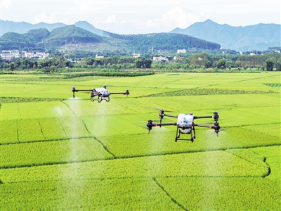 “现在,打药、施肥都用无人机,方便得很。”说着,他操控起一架无人机在绿色农田上来回盘旋喷洒农药,仅用1个小时就将150亩农田“飞了一遍”。