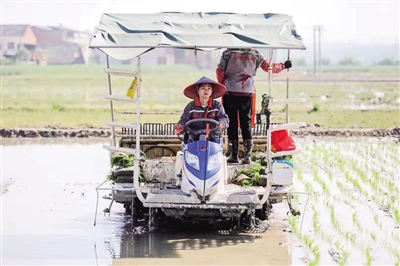 湛蓝天空下,绿油油的稻田里,不见面朝黄土,没有汗流浃背,2名农机手如同检阅般坐在驾驶位上,操纵着2台插秧机在田间往返,理盘、装机、插秧,各环节完美衔接,一气呵成。