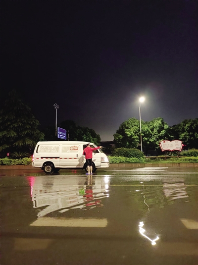 4月26日凌晨,我市突降暴雨,蔡伦大道杨柳汽贸城路段出现了较为严重的积水、内涝,大水淹没道路,造成不少车辆抛锚停在路中央,引起道路通行不畅。珠晖公安分局辅警刘作明经过此路段时,立马戴上警帽,充当临时“路标”,疏导交通,提示过路车辆小心驾驶,直到凌晨3时有关部门的工作人员前来,他才离去。