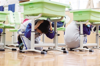 5月9日,浙江省湖州市教育康复学校的学生在进行地震自救演练。 随着全国防灾减灾日临近,各地校园开展应急避险教育活动,普及防灾减灾知识,以强化学生们的安全意识、提高自救自护能力。 ■新华社发