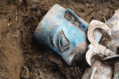 这是在三星堆遗址8号“祭祀坑”拍摄的铜人头像(5月31日摄)。