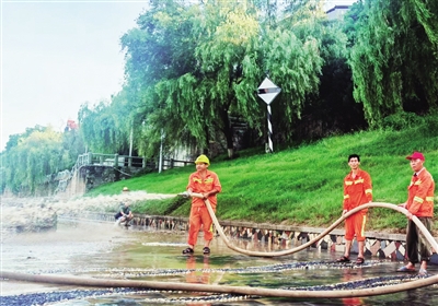 衡阳日报讯 ( 文/图 全媒体记者 胡亚华 通讯员 张衡萍)连日来,天气晴热,湘江城区段水位回归正常,湘江西岸风光带亲水平台上留下的厚厚淤泥,对市民游客正常休闲观景造成影响。自7月10日起,雁峰区环卫所开展湘江西岸风光带清淤专项行动,迅速组织20名环卫工人,动用水泵4台,对湘江西岸风光带亲水平台淤泥展开全面清理。