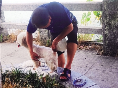 当日下午5时30分许,湘江西岸外滩湘江北路17号地段附近、柴埠门码头北侧小游园人气较旺,不少市民在游园内乘凉散步健身,一名身穿深蓝色T恤的中年男子领着一条白色的宠物狗来到一棵桂花树下,他从塑料袋内掏出电推剪,替狗修剪毛发,一撮撮狗毛掉落在四周,风吹狗毛四处飘散,不一会儿,小游园内飘着狗毛,不少游人见此情景,纷纷掩住口鼻,绕道而行。“小游园是市民游客休闲健身观景的场所,公共场所替狗剃毛,影响环境卫生,存在安全隐患。”在游园内健身的周大伯说,一些市民图省事,不拴绳遛狗,有的还在公共场所替狗剃毛,妨碍市民正常游园休闲。当地群众希望,相关职能部门应加大巡查力度,劝导并制止在公共场所替狗剃毛等不文明行为,共同维护湘江西岸外滩优雅清新的环境。