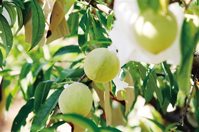 走进永和乡新场市社区菁香桃基地休闲采摘中心,一眼望去,套着淡黄色纸袋的菁香桃掩映在绿叶间,空气中充盈着菁香桃的香气……