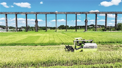 8月13日,在常宁市板桥镇西洞村,村民驾驶收割机在收割中稻(无人机照片)。眼下,湖南省常宁市的中稻进入收割期。当地农民抢抓晴好天气忙收获,确保颗粒归仓。■新华社发