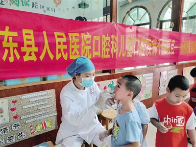 衡阳日报讯(全媒体记者 朱嘉林 通讯员 周特凡 何晓晓)为增强口腔健康观念和自我口腔保健意识,普及爱齿护齿知识教育,祁东县卫健局近日组织县人民医院,派出专业医护人员,走进楚源幼儿园莲花校区开展义诊活动,为256名儿童作口腔检查、免费牙齿涂氟,并为大家进行口腔保健知识宣教,用实际行动服务少年儿童口腔健康。