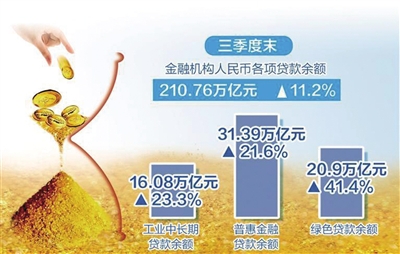 数据还显示,三季度工业中长期贷款增速持续提升。三季度末,本外币工业中长期贷款余额16.08万亿元,同比增长23.3%,增速比各项贷款高12.6个百分点,比上半年高2.1个百分点,比上年末高0.7个百分点;前三季度增加2.63万亿元,同比多增5860亿元。同期,普惠金融领域贷款保持较快增速。三季度末,人民币普惠金融领域贷款余额31.39万亿元,同比增长21.6%,比各项贷款高10.4个百分点;前三季度增加4.89万亿元,同比多增5757亿元。绿色贷款保持高速增长。2022年三季度末,本外币绿色贷款余额20.9万亿元,同比增长41.4%,比上年末高8.4个百分点,高于各项贷款增速30.7个百分点,前三季度增加4.88万亿元。三季度末,本外币涉农贷款余额48.5万亿元,同比增长13.7%,增速比上年末高2.8个百分点;前三季度增加5.46万亿元,同比多增1.46万亿元。