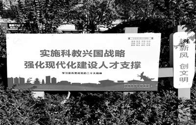 高新区园林绿化标准化工作的最大亮点,是宣传美化两全其美。高新区在园林景观内设置大型党建宣传牌、雕塑小品、宣传展板等,让公益宣传与园林景观融为一体。