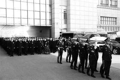 10时20分,8名礼兵荷灵,伴着哀乐缓缓走出告别室。习近平等护送江泽民同志的遗体上灵车。