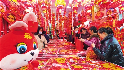 1月11日,在湖南省常宁市宜阳街道农贸市场,人们在挑选春节饰品。春节临近,各地年货市场红红火火,人们忙着选购年货,喜迎新春佳节。■新华社发