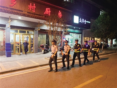 作为一名衡山义警,唐国成和队友们主要在盛豪小区到城北小学一带开展夜间巡逻。按照工作职责和要求,他每月都要在这个区域巡逻10天以上,每次巡逻都要持续至深夜,除了维护区域内的日常治安外,也要处理突发事件,做好群众咨询相关工作,往往是等到夜宵摊的客人都寥寥无几的时候,他才带着一身深夜的凉意归家。说到唐国成这个名字,当地的夜宵摊主们立刻就反应过来,“你说他呀,我们都认得,每天夜幕降临后准看到他们那抹熟悉的‘藏蓝’身影……”