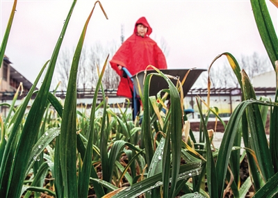 2月12日,河南省焦作市博爱县鸿昌街道九街社区的居民在雨中的菜园里忙碌。近日,全国多地降下春雨。■新华社发