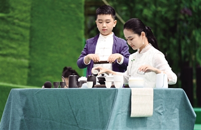 4月28日,第二十二届八大处中国园林茶文化节暨首届福建柘荣高山白茶文化周在北京八大处公园开幕。4月28日至5月3日茶文化节期间,八大处公园将举办高山白茶精品展、斗茶大会、品鉴推介会等一系列活动,丰富百姓“五一”假期生活。图为柘荣县第一小学茶艺社团的小茶艺师在开幕式上进行茶艺表演。 ■新华社发