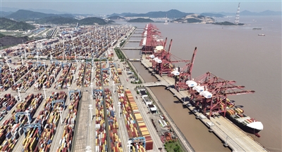 5月9日,货轮停靠在宁波舟山港穿山港区装卸货物(无人机照片)。 今年以来,宁波舟山港作业繁忙,港口运输生产实现平稳增长。据统计,宁波舟山港4月份完成集装箱吞吐量312.64万标准箱,货物吞吐量1.14亿吨,较前几月稳步回升。 ■新华社发