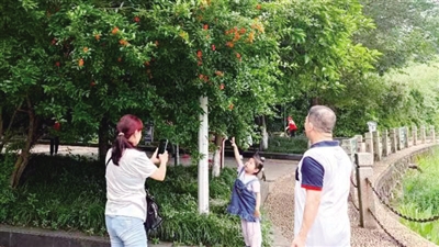 当天上午,阵雨后露出阳光,石榴花风姿动人,花色惊艳,有的花朵舒展盛放,随微风摇曳生姿。有的打着花蕾,蓄势待发,有的三五成群,朵朵并放。大红色的花瓣和桔黄色的花蕊,惹来了成群的小蜜蜂辛勤地劳作,也引来了不少游客和市民驻足观赏、拍照,为绿意盎然的莲湖广场增添了一抹靓丽的色彩。