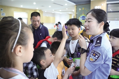 “浴火英雄”吉湘林、“扫黑先锋”包汉珺、“破案尖兵”李江……在全国公安系统英雄模范立功集体湖南(衡阳)代表先进事迹图文展现场,小朋友们聆听了英模们的英勇事迹。在110接报警中心、情指中心,“警宝”们通过现场参观、互动体验、知识问答等环节了解了更多警务知识。在禁毒课堂、反诈中心,“警宝”们认真观看毒品仿真模型,了解禁毒反诈知识,参与有奖问答。在刑事科学技术研究所,“警宝”们佩戴上“黑科技”眼镜体验利用激光观察留在物体表面的指纹。在前坪,“警宝”们观看了蘑菇车联警用巡逻机器人巡逻演示,与“机器巡警”亲密接触,亲手触碰、亲身体验各种警营装备。