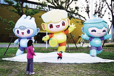 2021年11月9日,一位小朋友在大运河亚运公园里与杭州2022年亚运会吉祥物合影。大运河亚运公园位于杭州市拱墅区,由“一场一馆一广场两中心”组成,将承办杭州2022年亚运会乒乓球、霹雳舞和曲棍球赛事。■新华社发