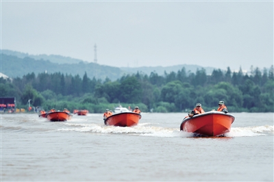 6月26日,防汛抢险应急演练人员驾驶冲锋舟巡逻。当日,2023年长沙市防汛抢险应急演练在湘江新区坪塘街道双湖垸举行。演练聚焦风险监测预警、联合巡查值守、应急保障、超标洪水防御、暴雨洪水险情应对、受灾群众安置等防汛重点应对处置工作,突出防汛抢险实战重点,着力于防汛应急处置能力提升。■新华社发