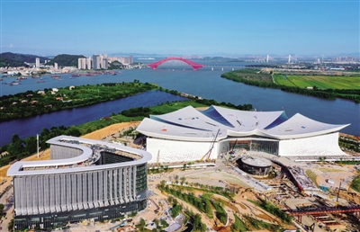 国际金融论坛(IFF)永久会址位于广州市南沙新区横沥岛尖,以“木棉花开,鸿翔海丝”为设计理念,目前项目主体建筑已经完成,正推进幕墙、机电和装修装饰等工作。