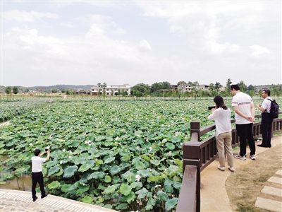 近年来,该村为改善稻田土质,提高稻田生产效益,将3000亩稻田全部轮种湘莲。湘莲种植一季后可产莲子和莲藕数年,往后只需每年翻耕即可。此举既美化了乡村,又带动了乡村旅游、餐饮等产业的发展。图为游客在拍摄莲花。