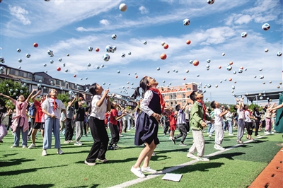 9月1日,在重庆市石柱土家族自治县三河镇三河小学,学生们在操场上抛出足球迎接开学。当日,全国多地学校迎来秋季开学。 ■新华社发