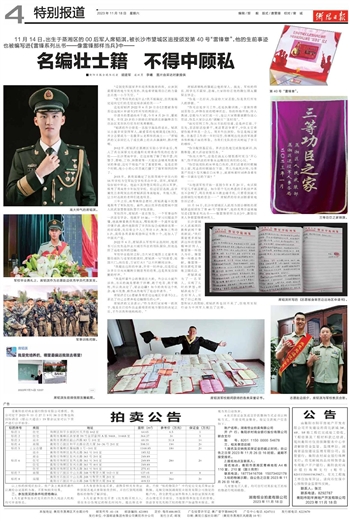 11月14日,出生于蒸湘区的00后军人席韬淇,被长沙市望城区追授颁发第40号“雷锋章”,他的生前事迹也被编写进《雷锋系列丛书——像雷锋那样当兵》中——~~~