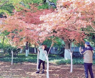 12月7日下午,记者现场看见,不少市民、游客聚集在树下,与红枫同框拍照合影。据了解,枫香园是岳屏广场红叶景观最美的地方,面积约2000平方米,景色秀美,搭配栽植了枫香、鸡爪槭、红枫等多种色叶树,枫叶红似火焰。园内栽植的红枫树30余棵,枫香树高10余米,胸径30余厘米,已在园内安家20多年,树叶从明黄如金到灿若红霞,树干挺直、树姿雄伟的枫香树格外抢眼。市园林绿化服务中心相关负责人介绍,枫叶变色受气温、光照等多种因素影响,今年秋冬偏暖,枫叶较往年红得晚些,因天气晴燥少雨,红枫的叶片略显焦枯,一旦刮风下雨,将迎来“落叶潮”。预计,红枫的最佳观赏期将持续到12月中旬。
