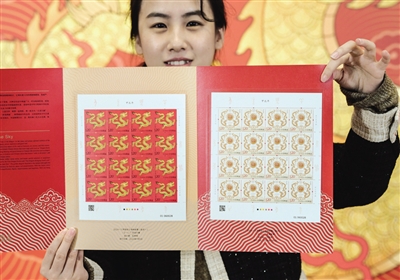 1月5日,《甲辰年》特种邮票首发仪式在北京中国工艺美术馆(中国非物质文化遗产馆)举行。邮票一套两枚,分别名为“天龙行健”“辰龙献瑞”。图为一名顾客在现场展示自己刚刚购买的《甲辰年》特种邮票。