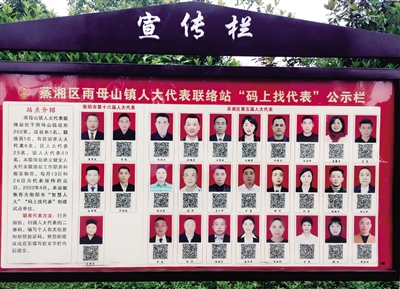 近日,记者在蒸湘区雨母山镇政府机关门口的宣传栏上看到,该镇的5位市人大代表、24位区人大代表的名单都公布在里面,每个人的照片、姓名下面张贴着一个二维码。