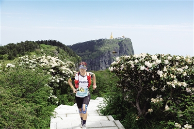 参加2024年峨眉山越野跑的选手从峨眉山景区万佛顶的杜鹃花丛旁跑过(5月26日摄)。