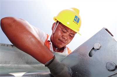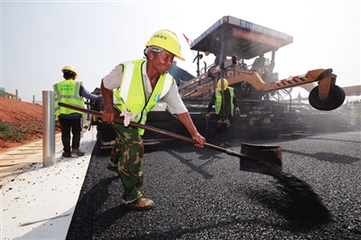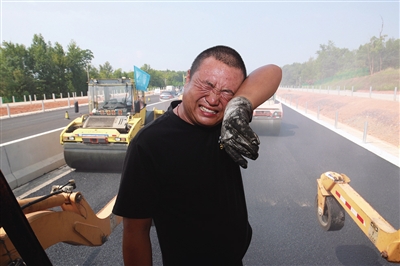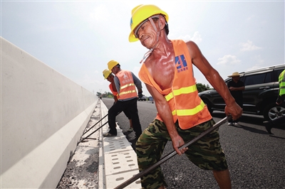 在烈日和高温沥青的双重“烤验”下,工人挥汗如雨。