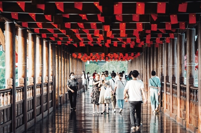 9月27日,随着“双节”临近 ,“气氛组”纷纷上线,东洲岛景区已基本布置到位,准备迎接八方来客。人行风雨桥上鲜红的国旗迎风飘扬,火热的“中国红”给东洲岛披上节日盛装,营造了喜庆浓郁的节日氛围。■王皓永 摄