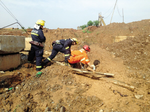 经过现场侦查及群众反映得知,这名妇女因要到达对面的土堆工地上干活,由于绕近道,不慎陷入泥潭,本想自身挣扎脱离困境,却越陷越深,不能动弹,只能呼救。指挥员通过对现场地形的仔细勘察,迅速组建了救援方案,采取就地取材、多人拉拽的方法进行营救。