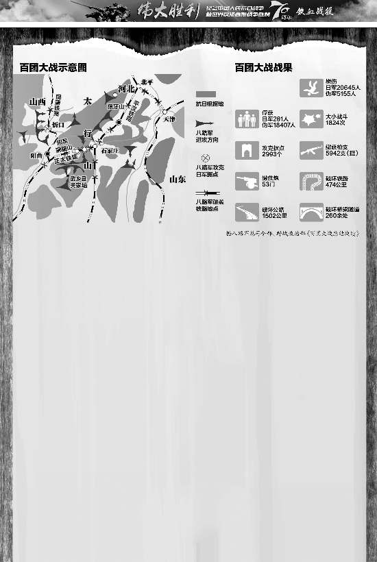 2015年8月18日 星期二 编辑:张 花 校对:刘 萍 版式:许宏亮 7 1940年,抗战进入第四个年头,华北、华东、华中依次沦陷,中日鏖战长沙,半个中国已陷于日军的铁蹄下。 为将华北作为发动太平洋战争的兵站基地,日军决意巩固占领,推行“治安强化”运动和“囚笼政策”,对八路军根据地进行大规模扫荡。 为粉碎“囚笼”,是年8月20日到12月5日,在八路军总司令朱德、副总司令彭德怀指挥下,先后105个团近20万人,以正太铁路为重点,向日军堡垒密布的2500公里交通干线发起破袭战,史称百团大战。 日军把这次战役称为“挖心战”,并把8月20日定为“挖心战纪念日”。 抗战史专家赵延庆表示,百团大战是抗战期间八路军在华北地区发动的一次规模最大、持续时间最长的战略性进攻战役,打击了日军的“囚笼政策”,打乱了其战略部署,延迟了其南进的步伐。 【启示录】 1938年,16岁的河北栾城人刘振魁报名参加八路军,成为129师385旅769团2营7连2排3班的