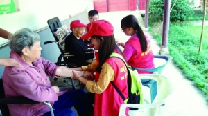 志愿者们在敬老院为老人按摩、陪他们聊天