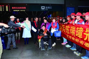 在高铁站接抗战老兵陈瑞璋 陈思竹 摄