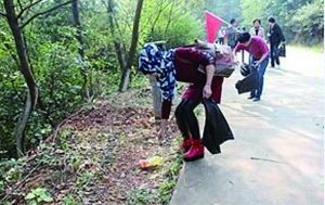 当天上午,该志愿服务队的志愿者们还前往雨母山,拿着垃圾袋与火钳,一路攀爬捡拾垃圾,细心地“搜索”每一个角落,用劳动拂去城市绿肺上的尘埃,旨在通过捡垃圾活动,树立起“城市是我家,美好环境靠大家”的理念。右图为志愿队正在捡垃圾中。