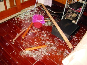 生锈的钢管砸到谢大伯的卧室,地面上一片狼藉