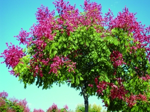 栾树春季嫩叶多为红叶,夏季黄花满树,入秋叶色变黄,果实紫红,形似灯笼,十分美丽。