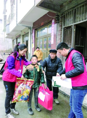 这天,市蓝丝带志愿者协会(以下简称市蓝丝带)的30名会员,分成7个组奔赴衡南县川口乡、相市乡、栗江镇,常宁市塔山乡,祁东县风石堰镇和衡阳市区,开展“2016年新年新衣新面貌”大型公益活动,给26个贫困学生送衣服、鞋子、牛奶和大礼包,提前送去新年祝福。
